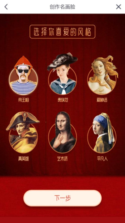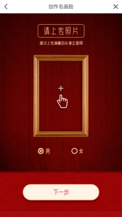 点击页面【请上传照片】,选择页面下方的【男】或【女】,点击【下一步】,即可在线生成创作名画脸照片!
