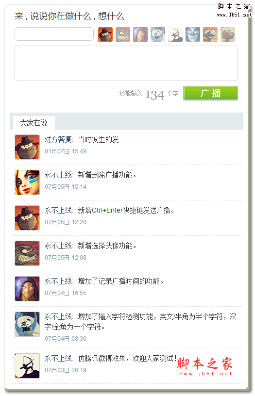基于JavaScript实现留言板添加和删除功能特效源码是一款类似新浪微博广播留言板JS特效代码。本段代码适应于所有网页使用,有兴趣的朋友们可以前来下载使用。本段代码兼容目前最新的各类主流浏览器,是一款非常优秀的特效源码。