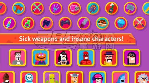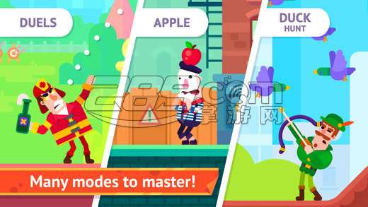 实际上游戏中的操作并不难,玩家只需要点击屏幕可以调整手中角色的射击角度和力度,只要在出手之前看好敌人方位然后据此行动即可。而在最基础的敌我互射模式中赢下足够场次,才能解锁更多的新玩法模式,比如打猎野鸭和射苹果大挑战,或者支持两位玩家PK的双人对战模式等。如果想要锻炼自己的射击技巧,也可以选择无尽模式。在该作之中玩家可以使用的角色并非只有初始那位希腊武士造型的胡子叔叔,还可以通过各种方式去入手其他新角色(共30位),里面甚至有某几位的造型能力是源自知名美漫和影视剧集,显得十分亲切。并且每位角色都有各自擅长的攻击方式,其中有部分甚至还可以在武器射出后进行二段式攻击操作,在出其不意的同时也能给予敌人更大伤害。